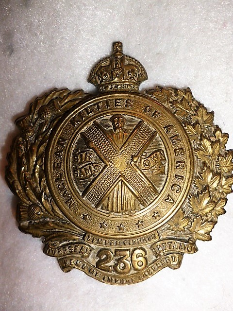 The 236th (New Brunswick Kilties) Battalion, nicknamed ‘Sir Sam‘s Own’ was authorized to be raised in New Brunswick with mobilization headquarters at Fredericton under General Order 69 of July 15th 1916 The 236th Battalion was one of three battalions to be raised primarily by the 74th Regiment (The New Brunswick Rangers) this regiment previously having contributed 73 volunteers to the 12th Battalion on its formation at Camp Valcartier in August 1914 and later the 55th and 145th Battalions. By mid 1916 the available supply of volunteers for the CEF had slowed down to just a trickle particularly in smaller rural areas. Recruiting for the 236th Battalion was going slowly until the ever energetic Sir Sam Hughes made a swing through the Northern United States with the Pipes and Drums of the 5th Royal Highlanders of Canada (The Black Watch) after which the ranks of the 236th were quickly filled with expatriate Britons and Americans of Scottish ancestry. In honour of the American volunteers a new Balmoral badge was introduced with the motto ‘MacLean Kilties of America ‘ replacing the former ‘The New Brunswick Kilties’. The 236th Battalion sailed for England November 17th 1917 with a strength of 27 officers and 1029 other ranks under command of Lieutenant-Colonel P.A. Guthrie (71st York Regiment), this number included the 247th Battalion raised in the counties of Victoria and Haliburton, Ontario, Sir Sam Hughes’s own political riding in which recruiting had dried up completely. In February 1917 the 236th was tentatively assigned to the 5th Canadian Division but was withdrawn in May 1917 and absorbed into the 20th Reserve Battalion, this the reinforcing battalion for the 13th and 42nd (Black Watch) Battalions serving in the field with the Canadian Corps in France and Flanders. The pipes and drums of the 236th amalgamated with other pipe bands to form the pipe and drums of the 20th Reserve Battalion. The 236th Canadian Infantry Battalion was disbanded under General Order 149 of September 15th 1920.