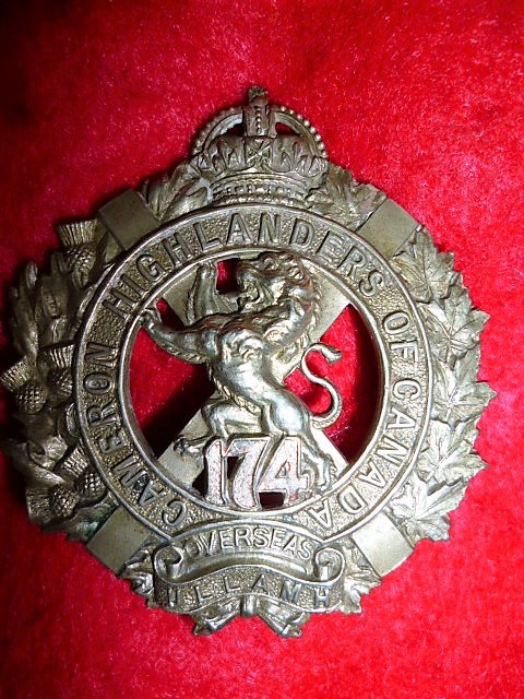 174th Battalion (Cameron Highlanders) Officer's Cap Badge 2 lugs Appears Silver Plated on the back, faint traces of red on the numbers "McDougall" Maker marked.