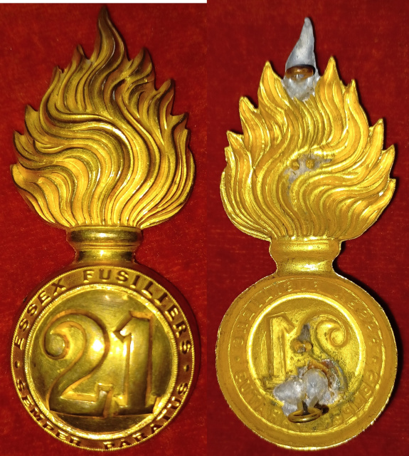 MM100 - 21st Essex Fusiliers Officer's Fur Cap Grenade Badge 2 replaced lugs,